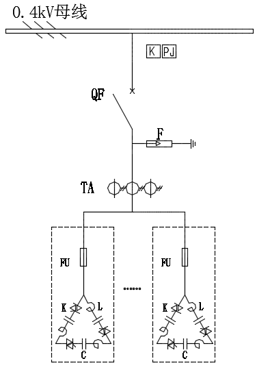 低壓TSC動態(tài)無功補償裝置采用人工智能控制,由控制器、雙向可控硅、電容器、電抗器、保護元件等組成。控制器實時跟蹤測量負荷的功率因數(shù)和無功電流,與預(yù)先設(shè)定的給定值進線比較,動態(tài)控制電容器組的投切,以保證功率因數(shù)達到設(shè)定值。整個測量執(zhí)行過程在一個周波內(nèi)完成(時間<20ms),并實現(xiàn)可控硅過零觸發(fā),確保投切電容器無沖擊、無涌流、無過渡過程
